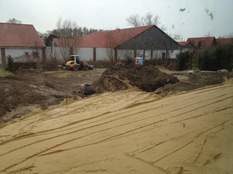 Im Garten begannen diese Woche die Bagger mit dem Errichten der Außenanlagen. In der rechten Hälfte des Gartens (siehe Foto) entsteht gerade die Parkplatzanlage.