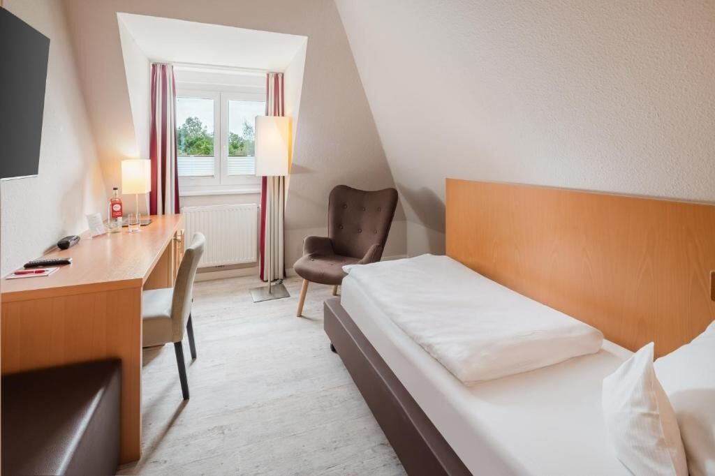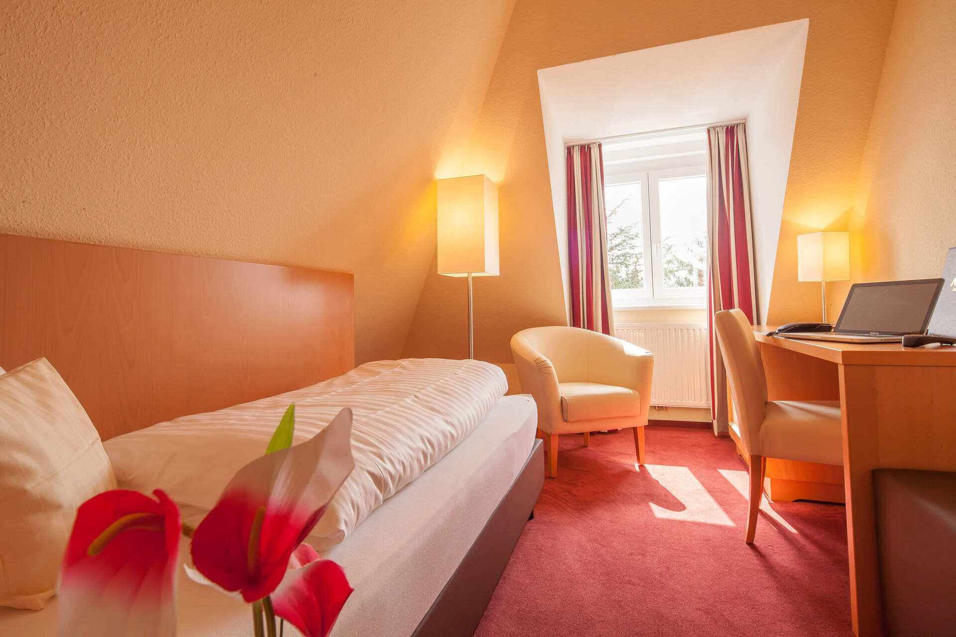 Die Einzelzimmer des Moin Hotels sind 16 m² groß und verfügen über Dachschrägen.